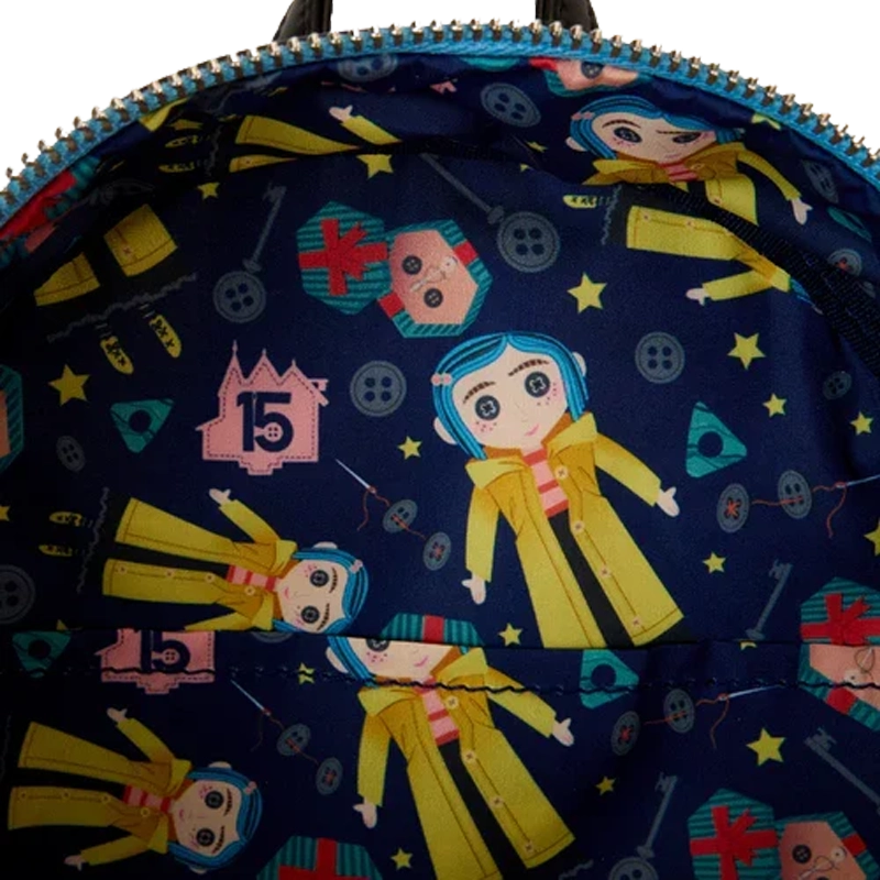 Step into Coraline’s world with this enchanting Coraline Doll Cosplay Loungefly Mini Backpack, created to celebrate the film’s 15th anniversary. Designed with playful detail, the front features the iconic doll version of Coraline, complete with real button eyes, embroidered accents, and her unmistakable golden raincoat. The metallic finish adds a magical shine from every angle, while her stitched arms and bright yellow details bring the character to life. A must‑have for Coraline lovers, collectors, and anyone who enjoys a little magic in their wardrobe.